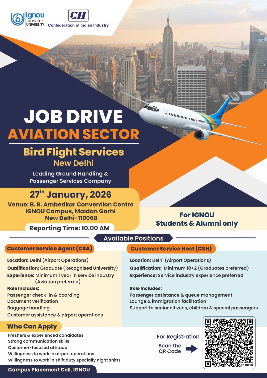 The Indira Gandhi National Open University (IGNOU), through its Campus Placement Cell (CPC), will organise an on-campus mega placement drive on 27 January, 2026 at the B. R. Ambedkar Convention Centre, IGNOU Campus, Maidan Garhi, New Delhi, commencing at 10:00 AM. The placement drive is exclusively open to IGNOU students and alumni and aims to provide diverse employment opportunities across the hospitality, business development, travel, and aviation sectors, reinforcing IGNOU’s commitment to enhancing learner employability and industry readiness.
